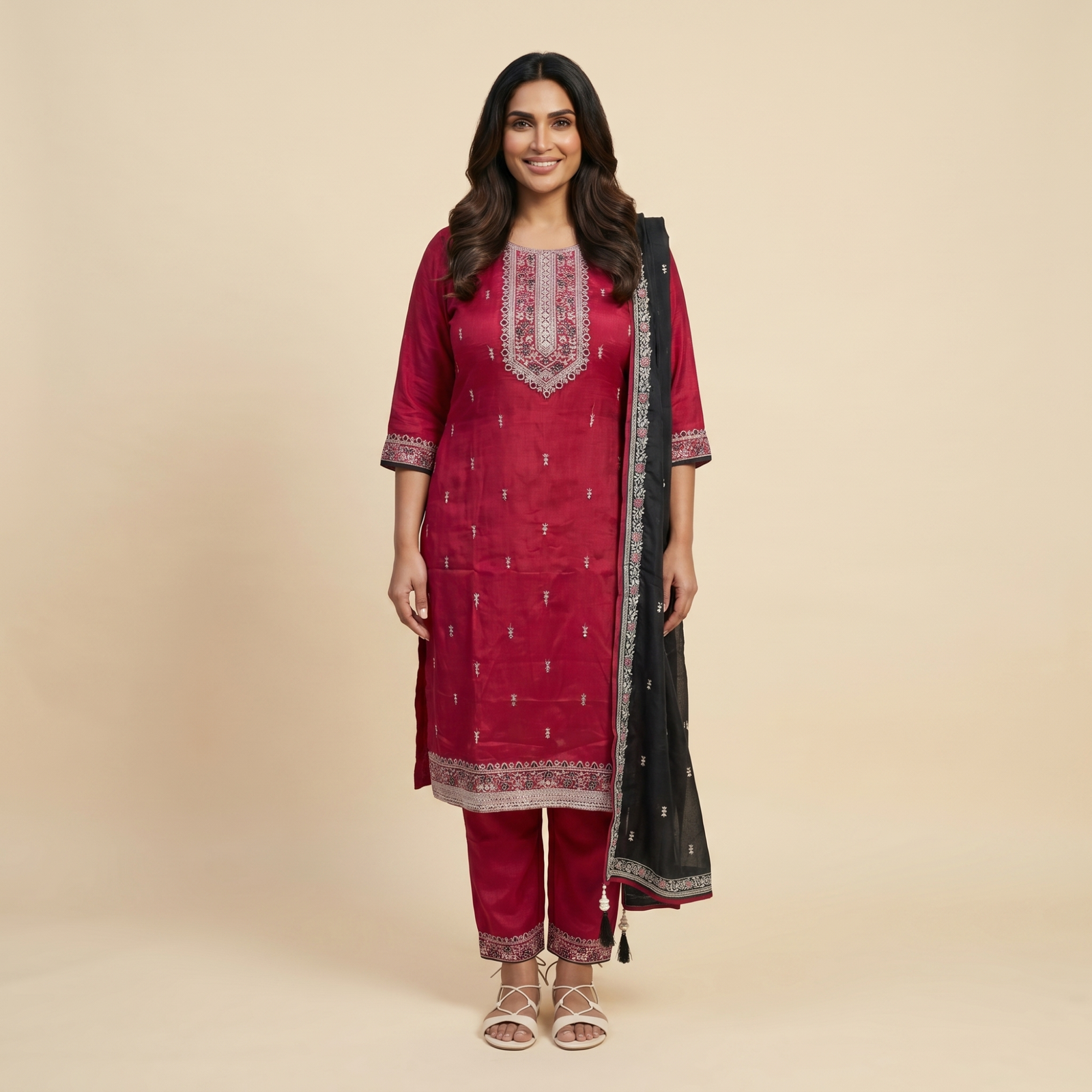 Dark Pink Floral Rayon Set with Delicate Embroidery