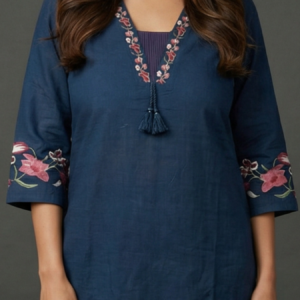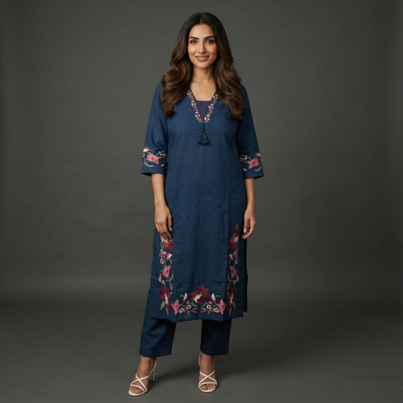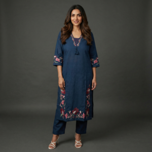The kurti features a stylish V-neck design highlighted with subtle embroidery, complemented by delicate embroidery near the sleeves and across the kurti, adding a refined and polished look. Paired with a beautifully designed dupatta, this set strikes the perfect balance between elegance and simplicity.