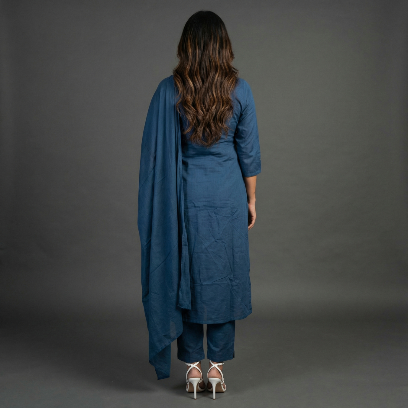 Refresh your everyday ethnic style with this graceful 3-piece kurti set in a soothing blue shade. Crafted from Mal cotton, the fabric is breathable, soft and comfortable, making it perfect for long hours of wear.