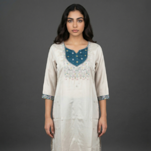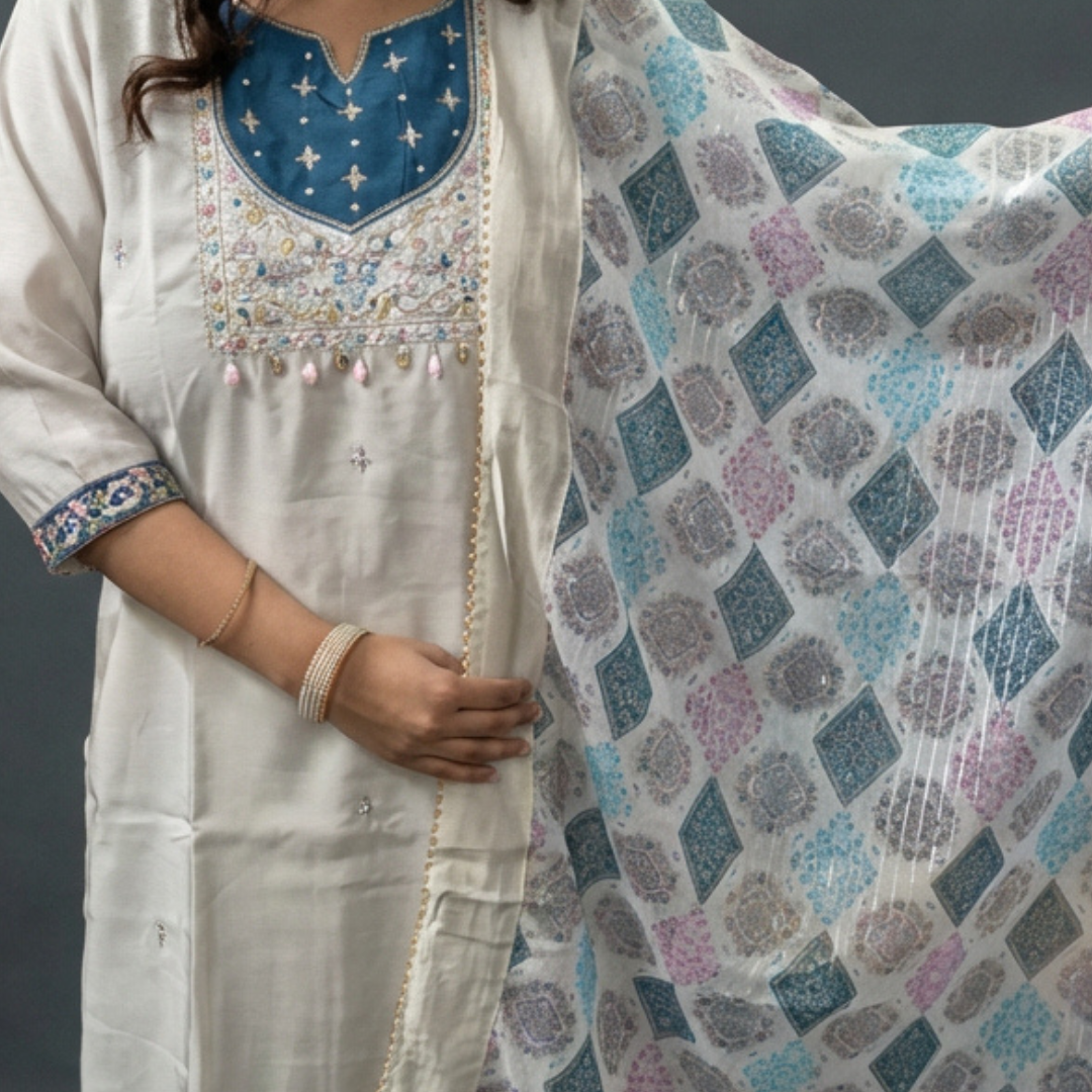The kurti features a round neckline adorned with delicate embroidery, complemented by matching embroidery near the sleeves and at the hem of the pant, adding a refined festive touch. The set is paired with a beautifully designed dupatta that enhances the overall look, making it perfect for special occasions.