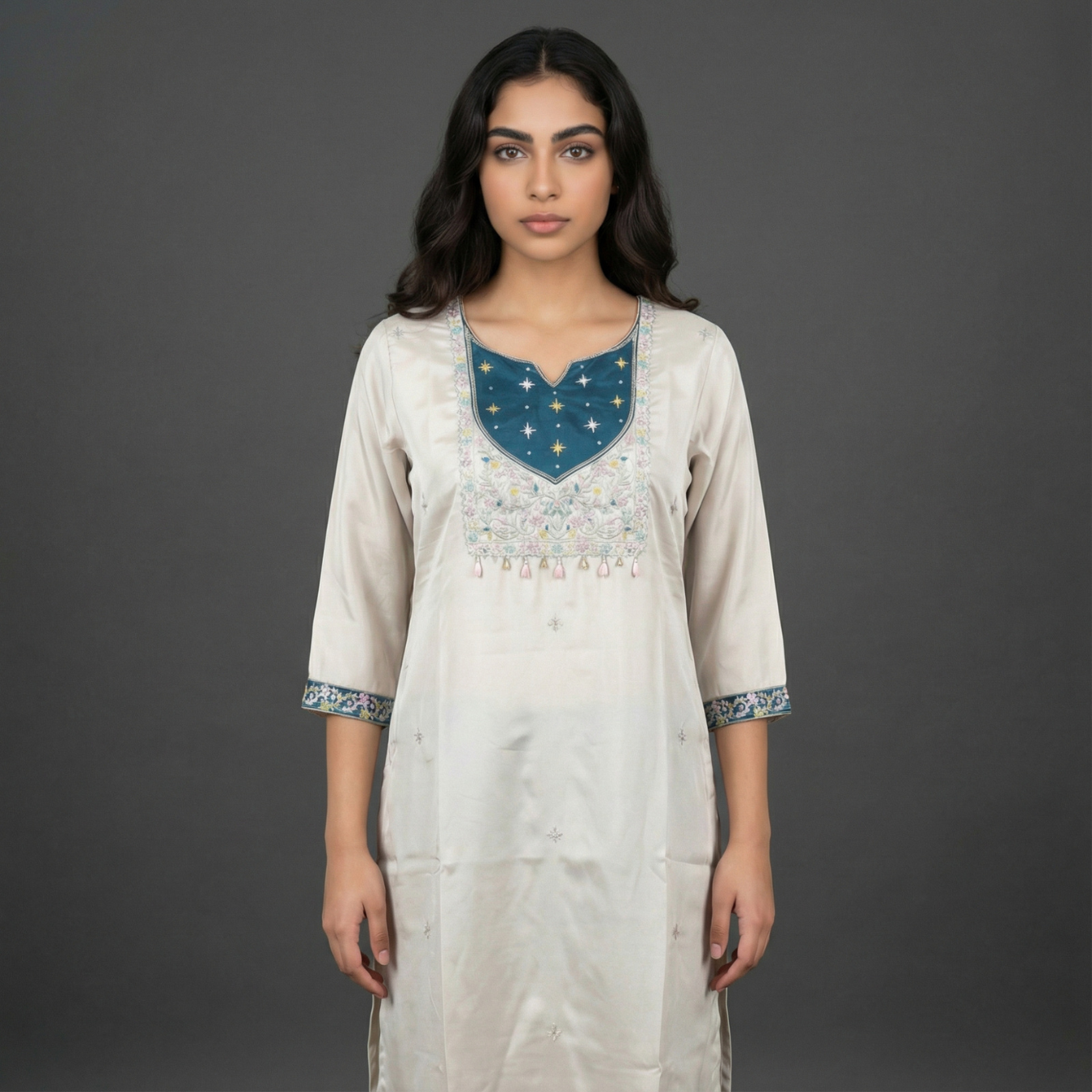 Elevate your ethnic wardrobe with this elegant 3-piece kurti set, thoughtfully designed for comfort and style. Crafted in a soothing light grey shade, this set is made from our new Pattaya soft knitted fabric, known for its ultra-soft texture, lightweight feel, and graceful drape.