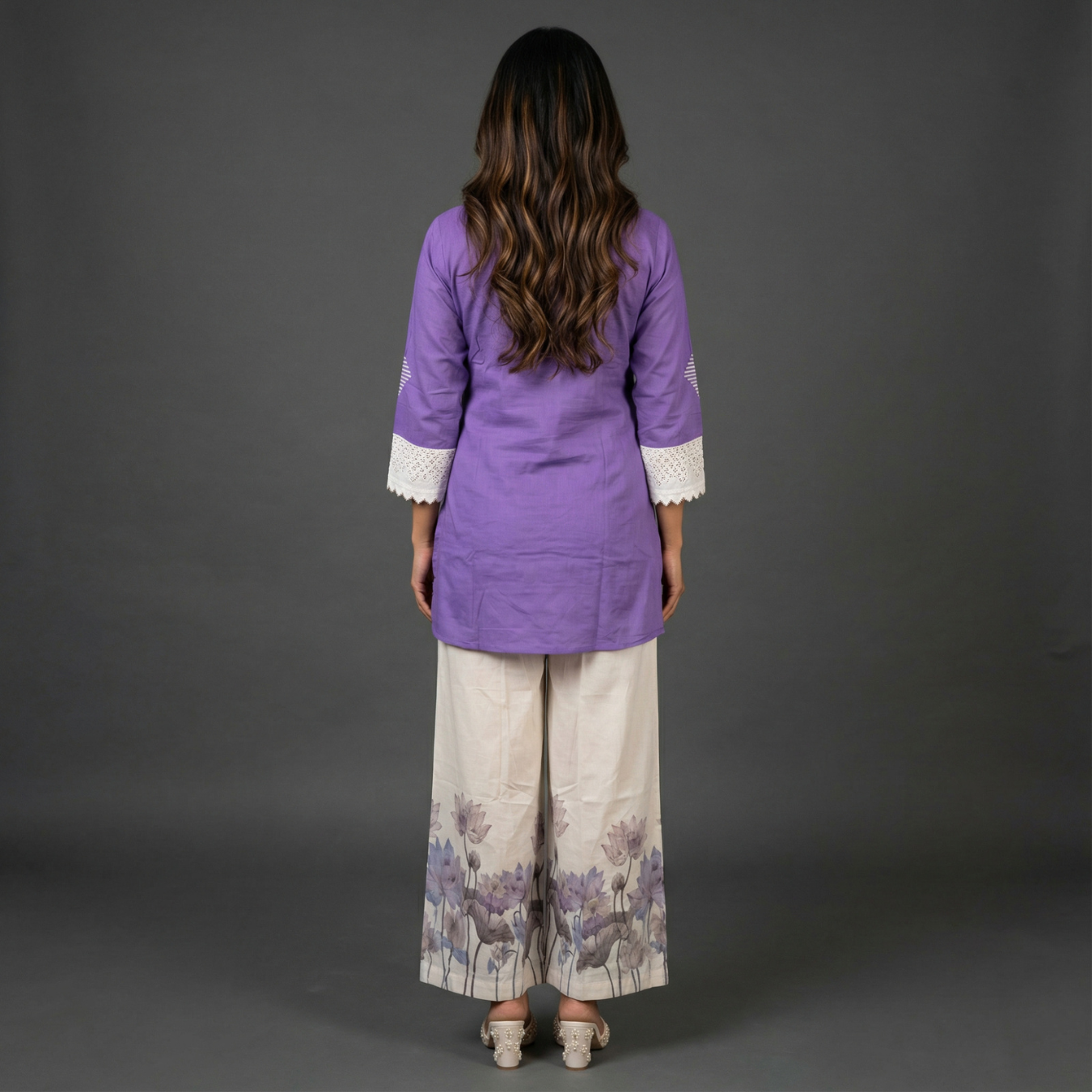 Make a statement with this elegant co-ord set featuring a rich purple shirt-style top paired with a classic off-white pant. Crafted from Khadi cotton, this set is breathable, comfortable, and skin-friendly, perfect for all-day wear.