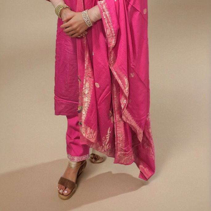 Refresh your style with a set that radiates grace and effortless charm. This stunning three-piece ensemble features the rich texture of premium Roman silk, elevated by intricate thread-work and a lightweight printed dupatta—making it a versatile masterpiece for your festive and social calendar.